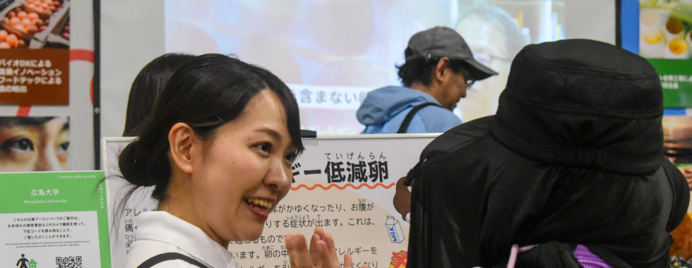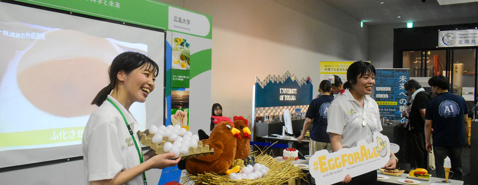 当拠点では、「みんなで食べる喜び:アレルギー低減卵の科学と未来」と題して、広島大学の研究内容を展示。動画やポスター、スタッフによる説明で、多くの方がアレルギー低減卵について関心を高め、理解を深めてくださいました。